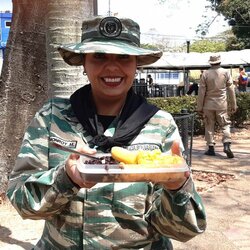 Jesus et Amalia, lui ancien garde-du corps, elle employée au tribunal, tous deux dans l’uniforme de la milice civico-militaire de défense de la patrie, treillis de la tête aux pieds. Avec son gilet pare-balle et son ceinturon garni d’armes de poing, Jésus, 1,95 m, impressionne. Amelia sous son sombrero de toile vert n’a pas renoncé à la coquetterie, rouge à lèvres très rouge, rimmel très noir. Ils nous conduisent en auto sur une grande place où des tentes sont dressées. Les miliciens font la queue pour pointer à la journée de mobilisation. Des mines fatiguées. Ils entrent ensuite dans un théâtre où se tient un meeting révolutionnaire. L’orateur, un galonné, ancien camarade de Chavez, pas avare de détails biographiques, relate la geste du commandante. Le message est limpide, ne reculez devant aucun sacrifice pour défendre la patrie, montrez-vous dignes de l’héritage de Bolivar et de Chavez. A la sortie du meeting, une nouvelle queue se forme. Cantinières et cantiniers en treillis distribuent des « rations de combat » soit un grand bol riz-haricots rouges arrosé d’une sauce qui contient un peu de viande. Et une boisson sucrée. Les trois amis saluent des camarades, vident leur bol à l’ombre des arbres de la place (je ne suis jamais fichue de nommer les arbres tropicaux). Je décline poliment la « ration de combat », je ne la mérite pas. Je soupçonne quelques pauvres miliciens d’être venus pour se remplir le ventre.