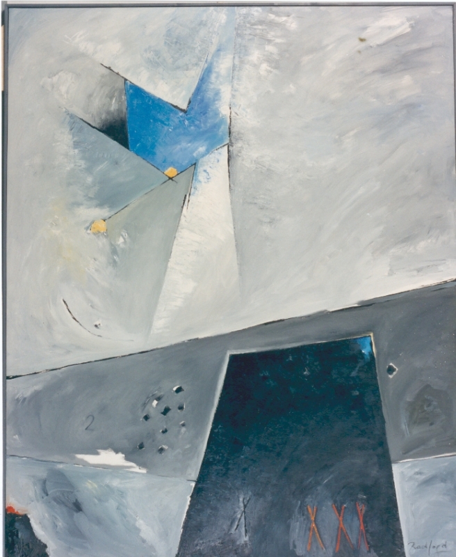 Mais pourquoi tant de bleus sur les toiles de Radford, des bleus si intenses, si profonds ? Bleus des tropiques aveuglants, bleus grecs, bleus turquoises, bleus à outrance. Ces bleus, je les vois comme transcendés par la mémoire, réinventés par l’éloignement. Des bleus de l’exil en somme.