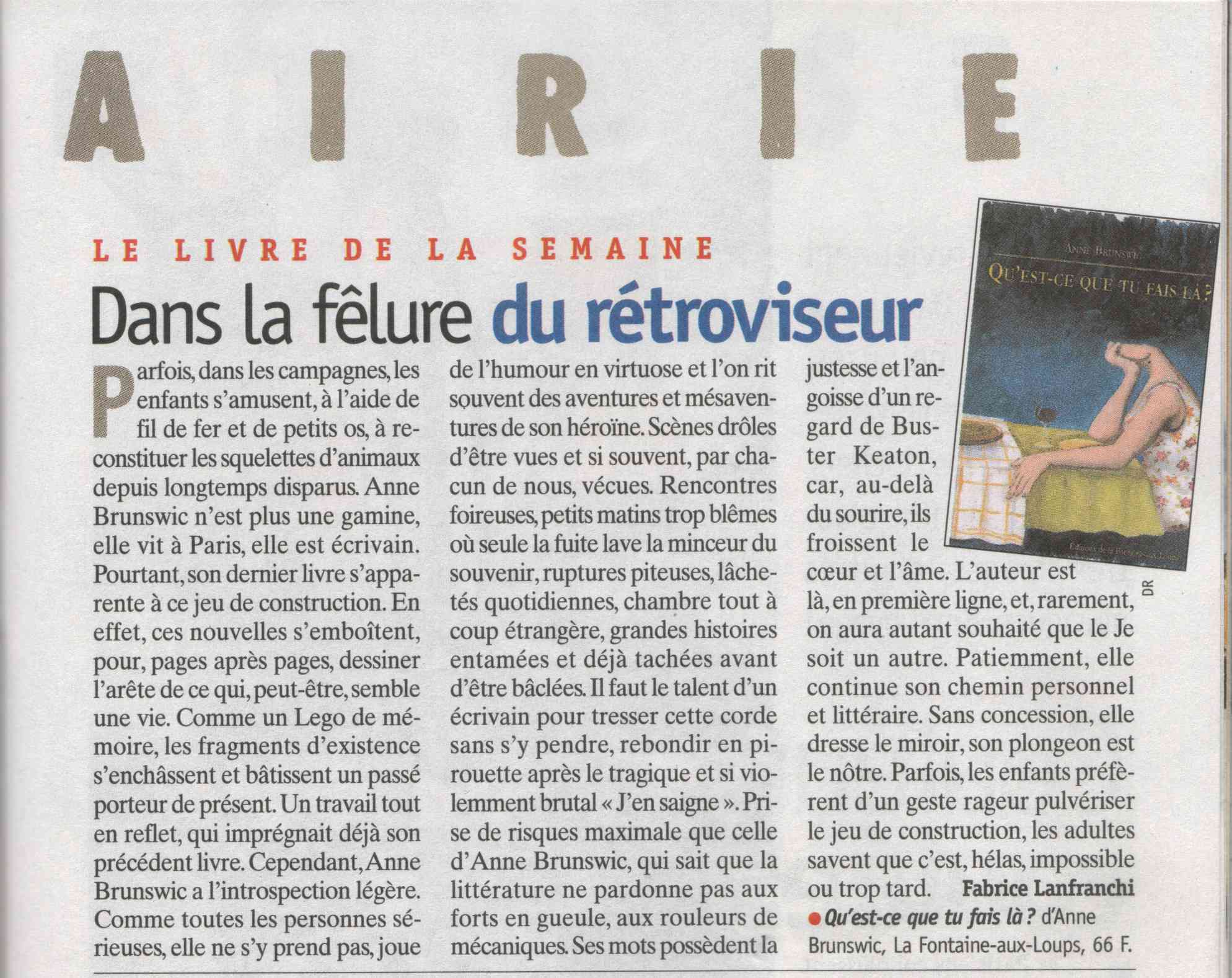 Ces blessures secrètes, ces histoires qui ne tournent pas comme il faut, Anne Brunswic a l’art de les dérider, toujours avec une pudeur renversante, et le clin d’œil en bandoulière. L’acuité de son regard, la musicalité de son écriture, la limpidité de son propos éclairent finalement les recoins d’une fraternité qu’elle désespère de ne plus pouvoir partager. N’oublions pas aussi ses qualités de conteuse. La nouvelle intitulée Faux pas, qui narre une randonnée estivale dans le Tyrol soudainement enneigé, est un joyau taillé sur mesure.