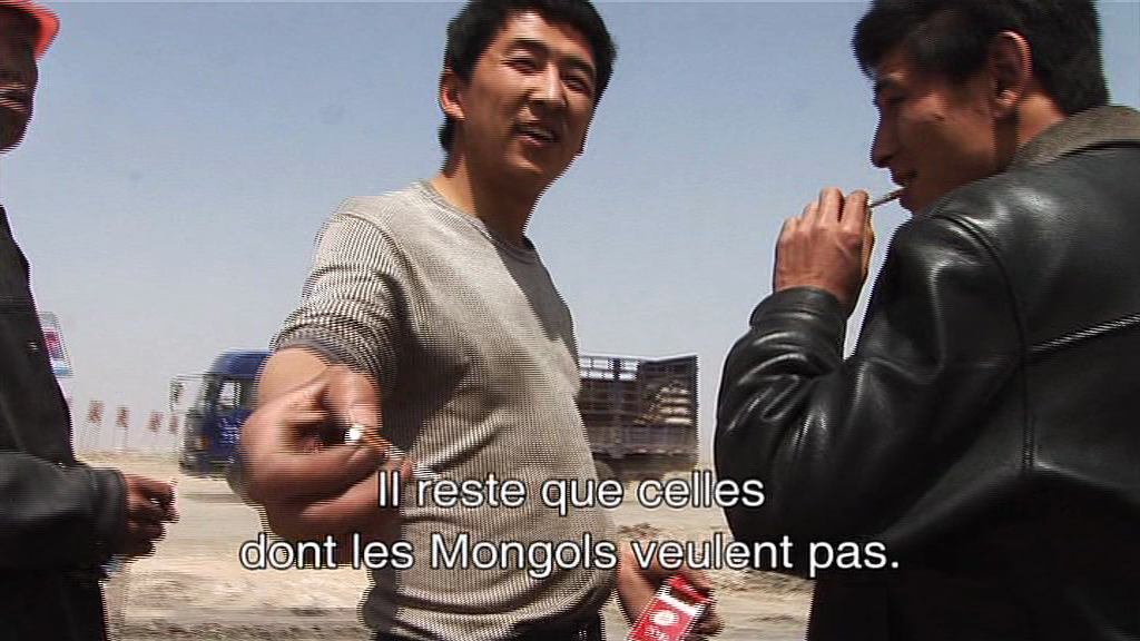 L’histoire commence dans le désert de Mongolie intérieure, à proximité d’une mine de charbon à ciel ouvert, sur un plateau balayé par un vent de sable et de poussiers où il est bien difficile d’allumer une cigarette. Le propriétaire de la mine (à gauche avec le casque orange) vend son charbon à des artisans camionneurs qui viennent parfois de fort loin pour l’acheter. Ses affaires prospèrent : la mine qu’il a achetée il y a quelques années a déjà presque doublé de valeur. Le charbon »“ même de qualité médiocre »“ trouve facilement preneur. La position des camionneurs (au centre et à droite de l’image) est moins assurée. Leur marge bénéficiaire, amputée par les taxes, les péages, les contraventions, le prix du carburant, les repas et les nuitées sur la route, fluctue fortement en fonction des cours du charbon. Une autre variable a son importance : la qualité de la marchandise car il arrive que dans les veines superficielles, des pierres se mêlent au charbon dans une proportion importante.